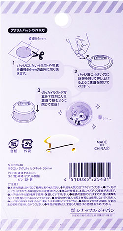 アクリルキットの土台とフタに挟むだけなので簡単できれいにでき上がります。1個ずつ違うオリジナルなカンバッジを作るのに最適。(*^_^*)